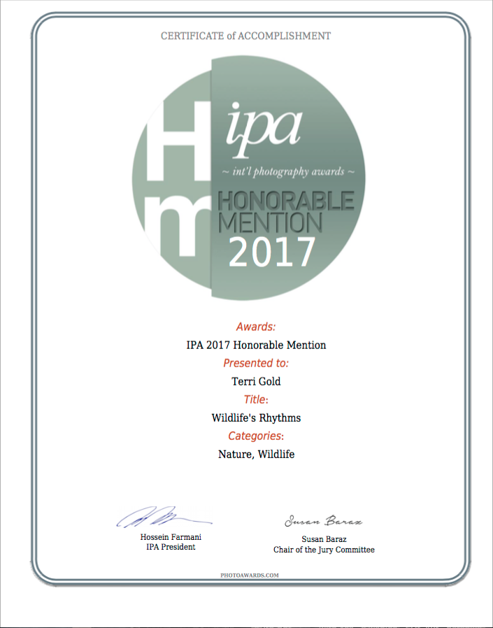 LOS ANGELES 11/15/17 – Professional photographer Terri Gold of the United States was presented with the 12th Annual Black and White Spider Awards Honorable Mention in the category of Nature at a prestigious Nomination & Winners PhotoShow streamed Saturday, October 14, 2017.