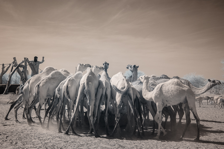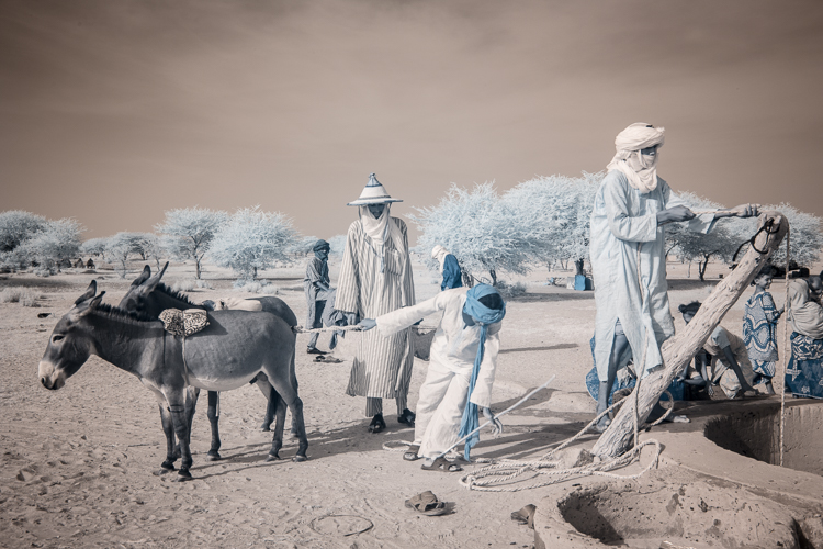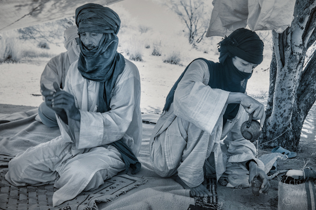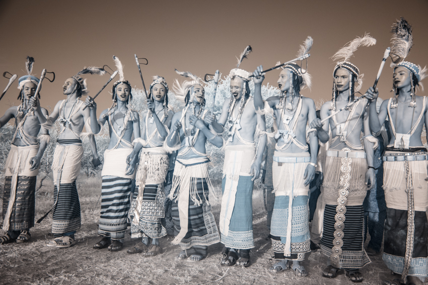 Screenshot 2016-01-29 15.02.25Inspired by a friend’s photograph that had been painted, Gold began painting on her own prints, often adding encaustic wax. She sometimes uses extensive post-processing and is fond of split toning. “Taking pictures is just the beginning for me,” says Gold. In the pre-digital days Gold had to carry four to five cameras—everything from several 35mm cameras loaded with regular and infrared film to a Mamiya and a Hasselblad and film changing bags. “I would freak out at airports and beg the customs people not to open my infrared film canisters. Now it’s a lot easier, and I travel with converted infrared digital cameras.” She usually carries a Canon EOS 5D Mark III. “Digital has freed me up so much,” says Gold. “I have more freedom in aperture, exposure, and shutter speed. And now for the first time with infrared I can get some idea of what I am shooting.” Gold captures almost all her subjects in infrared but admits, “It doesn’t always work. I know it has its limitations, but I always give it a try. I always also have a color camera along with me.” If making memorable photography is about capturing a moment, then Terri Gold’s trip to Niger is a life lesson in the importance of making those moments happen. As she readily admits, it would have been very easy for her to cancel her trip because of all the perceived dangers. “In fact, a week or so after we left Niger, al-Qaeda rebels spilled over into the country from Libya,” she says. “If we had cancelled or delayed our trip, we never would have gotten back there.” But she didn’t cancel. She braved 110-plus degree Fahrenheit heat to document a ceremony in one of the world’s most remote deserts and returned with powerful images. For all the travel warnings, her trip went smoothly. “Any worries about violence and unrest disappeared during our time amongst the welcoming Wodaabe, especially when we camped under a tapestry of the Milky Way accompanied by the chanting of the nomads and the lullabies of their animal herds.” While she hesitates to describe herself as brave, she says she now understands completely the Wodaabe adage she learned on her trip: Who cannot bear the smoke will never get to the fire. • terrigoldworldimagery.com